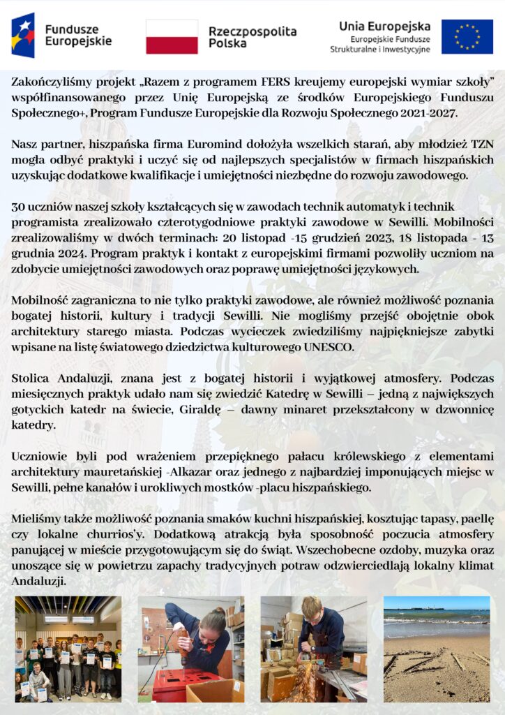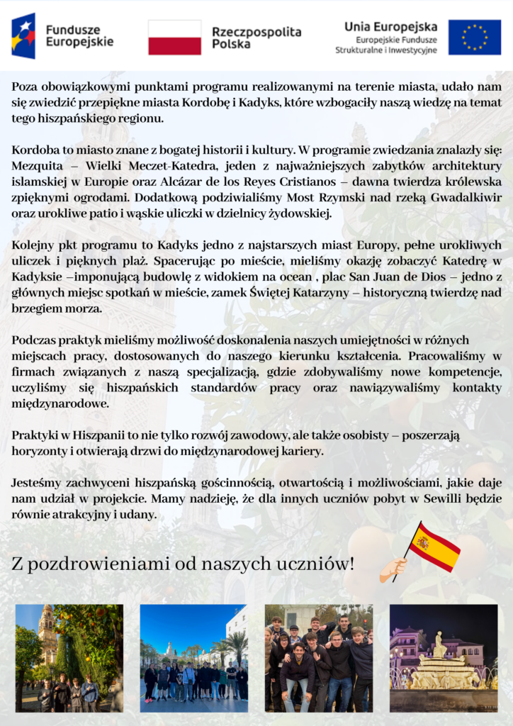 PROJEKT pt.”Razem z programem FERS kreujemy europejski wymiar szkoły realizowanego w ramach projektu: „Zagraniczna mobilność edukacyjna uczniów i absolwentów oraz kadry kształcenia zawodowego” Lista uczestników Regulamin Sewilla Załącznik formularz Deklaracja uczestnictwa w projekcie Lista Uczestników Grupa 2