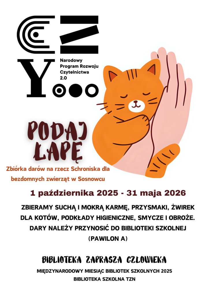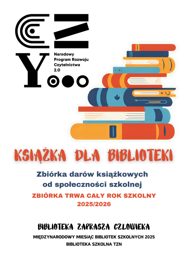Zbiórka trwa od 1 października 2025 do 31 maja 2026. Dary przyjmujemy w Bibliotece Szkolnej TZN, znajdującej się w pawilonie A na I piętrze.