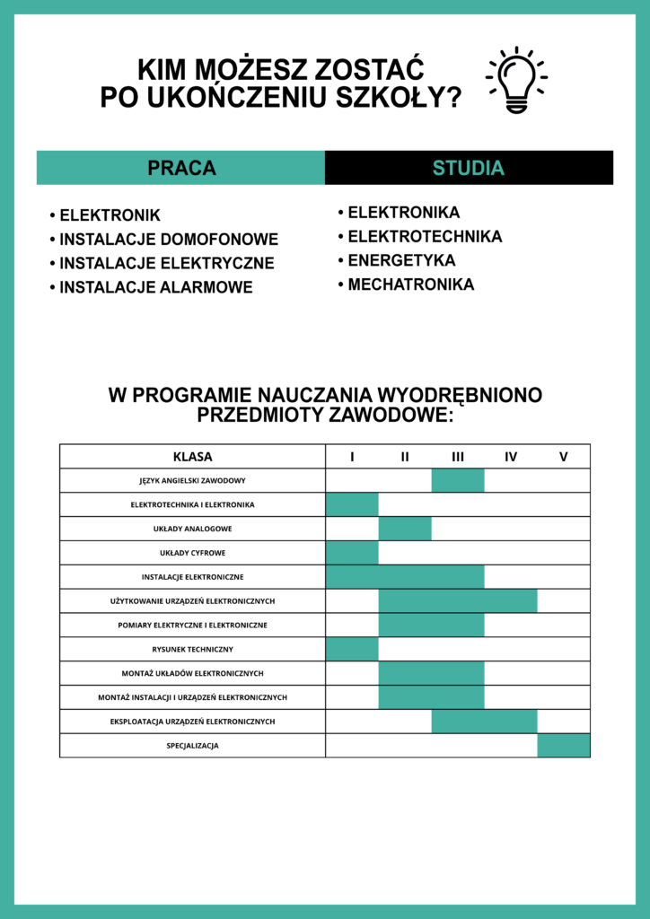 Możesz po ukończeniu szkoły kontynuować naukę na wyższej uczelni na kierunkach technicznych lub prowadzić własną firmę w branży elektrycznej.